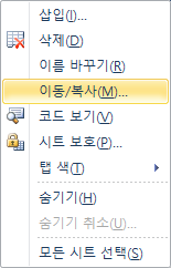 1. 이동 / 복사 할 대상 엑셀 파일을 열어 둔 다음 아래와 같이 시트 탭에서 우측 버튼을 누르고,