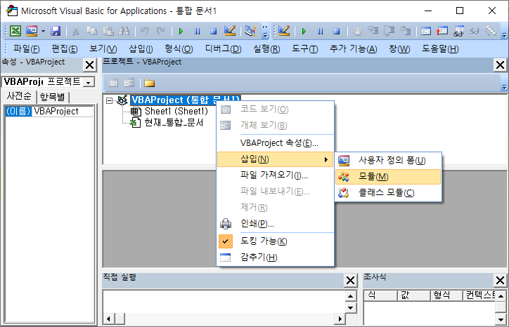 2. 엑셀 파일을 열고, 알트(Alt) + F11키를 눌러 비주얼 베이직 창을 열어 준 다음, 아래와 같이 'VBAProject 문서명'을 마우스로 우측 클릭 한 후 삽입 > 모듈을 차례로 클릭합니다.