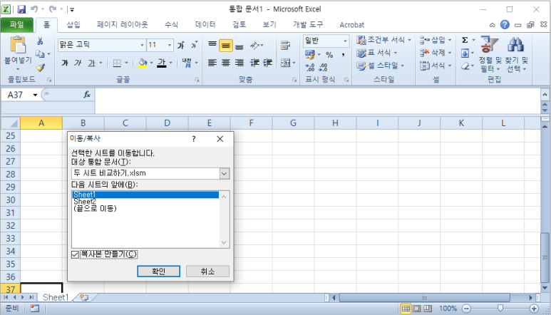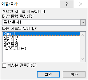 3. 시트 들이 복사 / 이동 했을 때의 위치를 정해준 후 복사본 만들기를 체크 해 주고 확인 버튼을 누르면 선택한 엑셀 파일로 선택 한 시트 들이 복사됩니다.