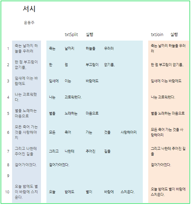 '서시' 한 문장이 각 셀마다 아래와 같이 들어 있다고 하면, txtSplit 함수를 실행하면 문장을 공백(스페이스)로 구분하여 각각의 셀에 입력 됩니다.