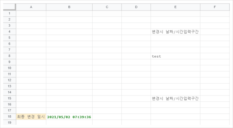 아래 함수는 E4 ~ E15 구간에서 변경이 있으면 B18 범위에 변경된 연월일시를 자동으로 기록해줍니다.