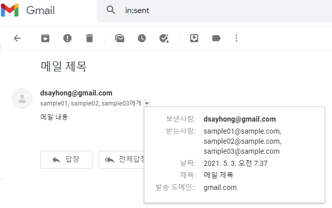 메일 발송 회당 50명까지 동시 발송 가능하고, 아래 스크립트와 같이 받을 사람들의 이메일들을 변수 처리 하면 됩니다. 유의 해야 할 것은 무료계정의 경우, 하루 쿼터가 100개(일반, 참조 메일 등 모두 포함)입니다. 워크스페이스 계정의 경우 1,500개입니다.