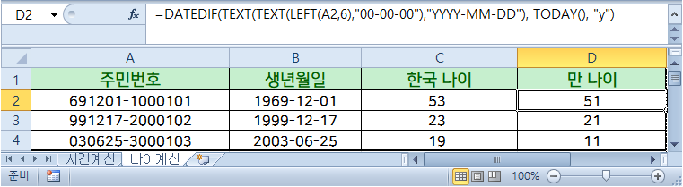 주민 번호 형식으로 입력 된 데이터를 기준으로 생년월일, 한국나이, 만 나이(국제통용)를 계산하는 방법을 살펴 보겠습니다.