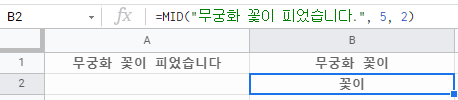 아래와 같이 입력하면 '무궁화 꽃이'가 입력되는데 공백을 포함해서 카운트 합니다. =MID("무궁화 꽃이 피었습니다.", 1, 6) '문자열이 A1에 있다면 =MID(A1, 1, 6) '문자열의 첫번째 ~ 6개를 선택 =MID("무궁화 꽃이 피었습니다.", 5, 2) '이렇게 입력하면, '꽃이'가 입력됩니다. '문자열의 다섯번째 ~ 2개를 선택