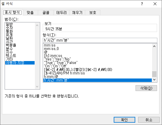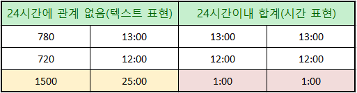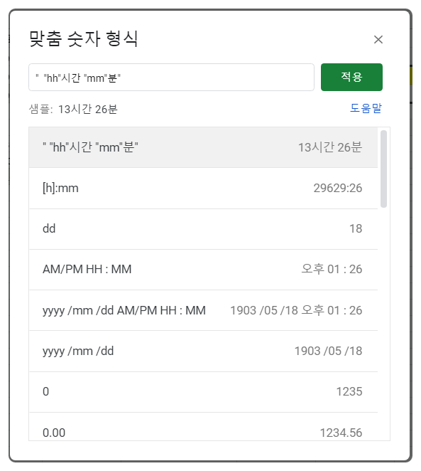 구글 스프레드시트의 서식에서 맞춤 숫자 형식으로 시간과 분을 표현해줍니다.