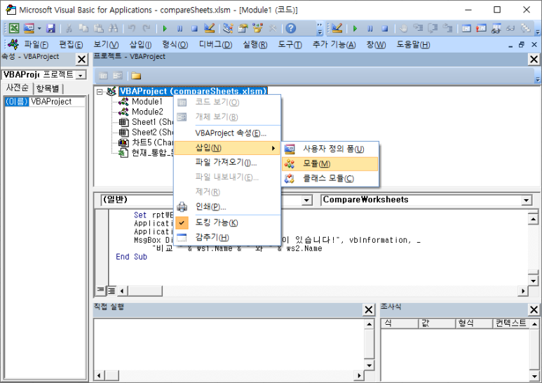 매크로는 함수 실행을 위한 checkCompareWorksheets() 와 CompareWorksheets() 두개로 나뉘어져 있습니다. [ 파일은 아래 '예제파일 다운로드'를 참조해주세요. ]