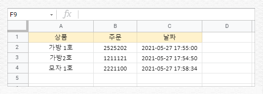 조금 응용해보면 아래와 같이 B행에 주문이 들어오면, 현재 시간을 C행에 기록해줍니다.