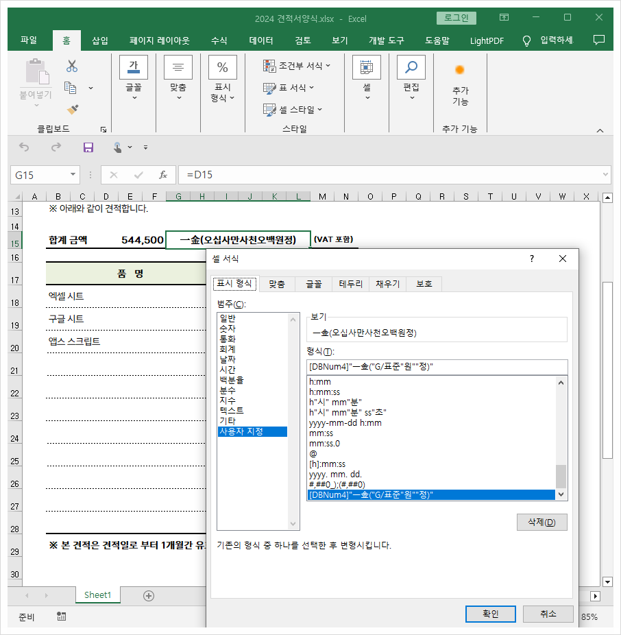 ▶ 'G15' 합계 부분은 'D15' 의 합계 값을 참조해서 셀 서식 ▷ 표시 형식 ▷사용자 지정을 클릭하여 아래와 같이 입력하여 값을 한글로 표현해줄 수 있게 설정하였습니다.