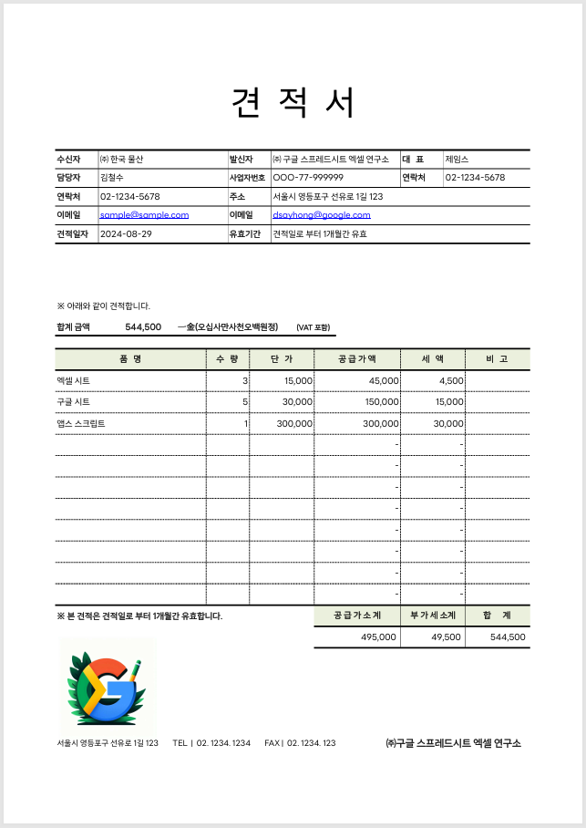 ▶ 아래와 같이 일반적인 견적서의 포맷에다 필요한 몇가지 내용을 추가해서 만들었습니다. 또 왼쪽 하단에 이미지 로고를 넣을 수 있게 지정하였습니다.