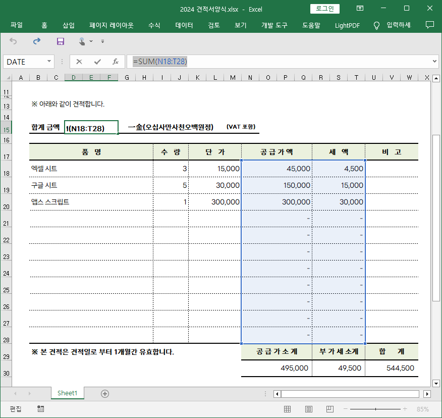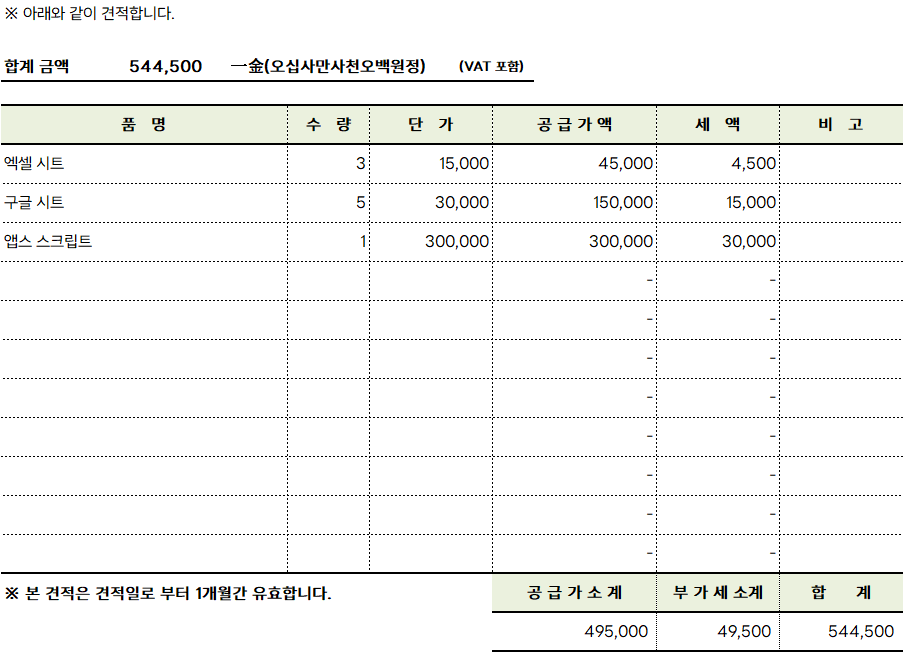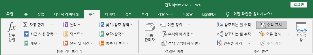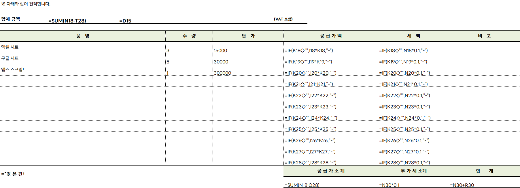 아래와 같이 견적서 작성 부분에 입력된 모든 수식을 확인 할 수 있습니다.
