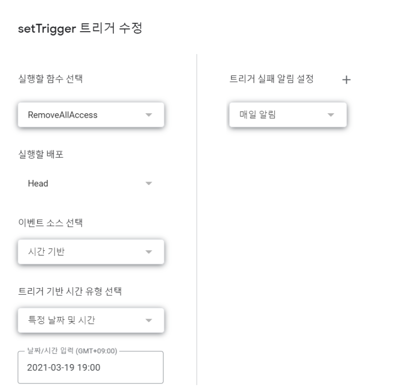 ▶ 이 매크로(스크립트)는 시간 기반 트리거로 지정된 일자에 시트에 공유된 편집자들을 모두 삭제할 수 있게 트리거를 설정해줍니다.