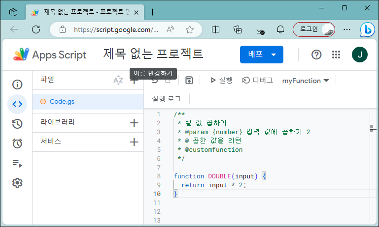 아래 Double 함수는 구글 앱스 스크립트 개발 사이트의 기본적인 예제 사용자 함수입니다. 앱스 스크립트 에디터에 스크립트를 작성하고 단축키 Ctrl + S를 누르거나 디스크 모양의 아이콘을 클릭해서 저장해줍니다.