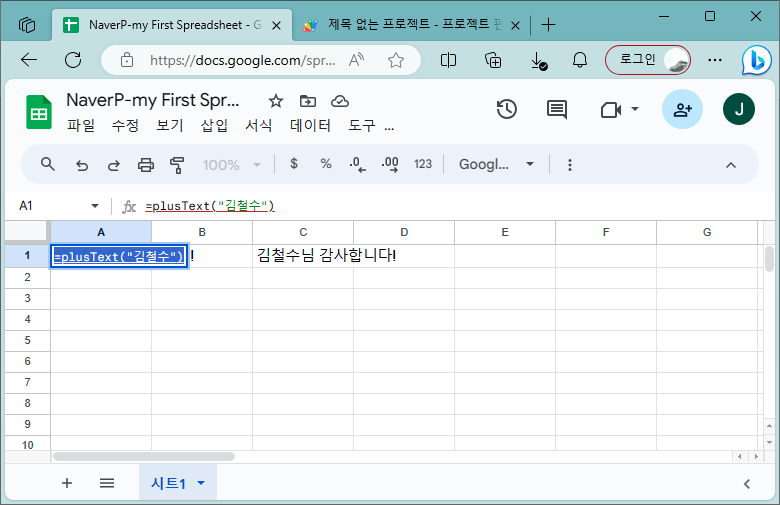 간단한 앱스 스크립트를 한 개 더 작성해볼까요? 다음은 입력 받은 문자열에 "님 감사합니다!"라는 문자열을 합쳐서 출력하는 예입니다.
