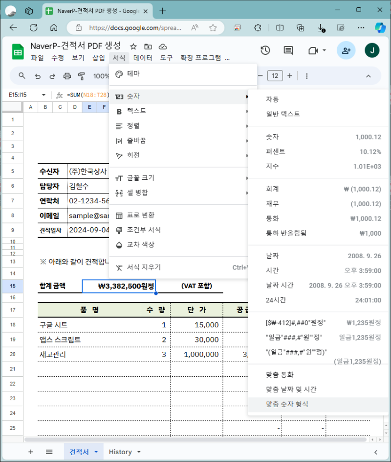 구글 시트 견적서 양식 & PDF 자동 생성, History 작성, 메일 발송