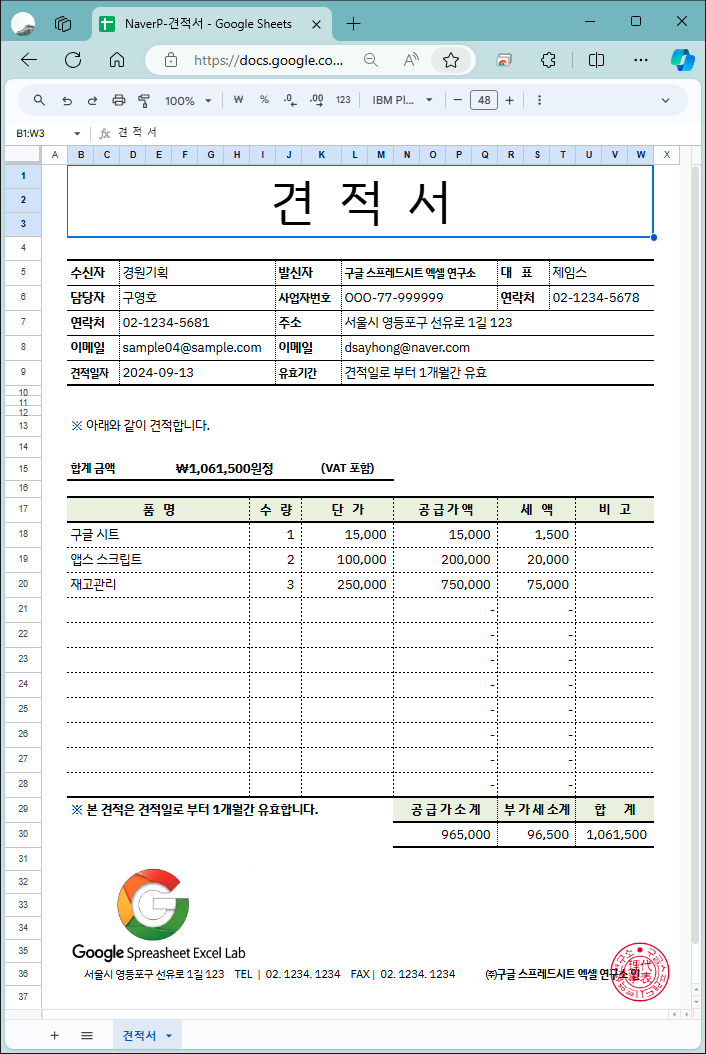 【 구글 시트 견적서 작성 샘플 】