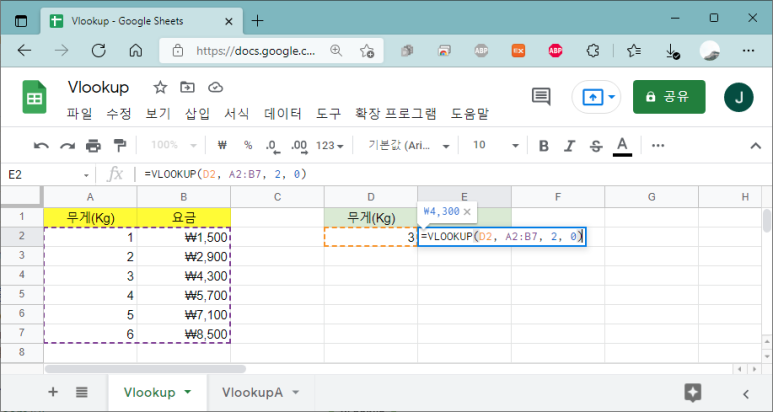 다음과 같이 요금표를 작성하고, 무게를 입력 했을 때 요금이 반환되는 수식을 아래와 같이 사용해서 검색할 수 있습니다.