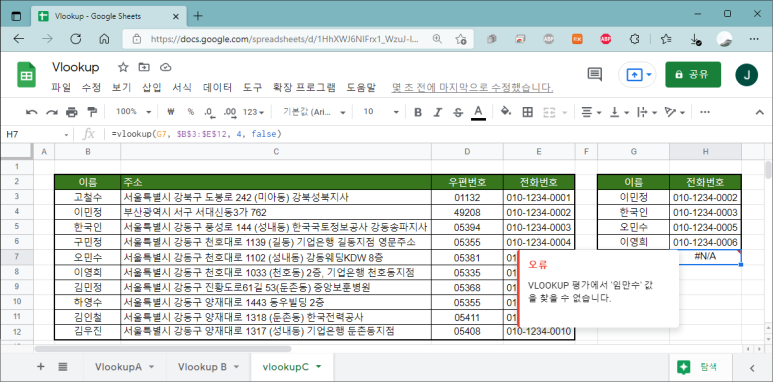만약 데이터에는 없는 이름을 조회 값으로 입력하는 경우에는 다음과 같이 '#N/A'에러가 발생하게 됩니다.