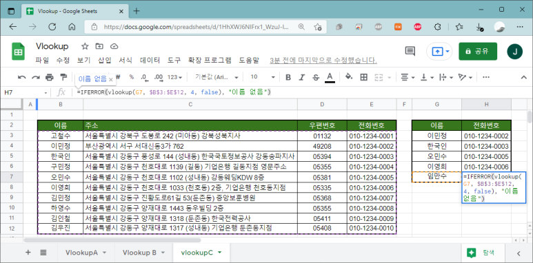 =IFERROR(vlookup(G7, $B$3:$E$12, 4, false), "이름 없음")