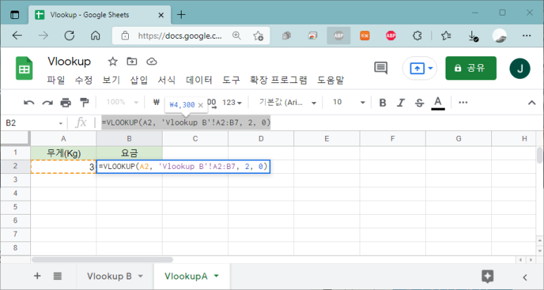 'D2' 셀에 무게를 '3'을 입력하면, 수식에 의해서 'E2'에 '₩4,300'이라는 요금이 반환되는 것을 알 수 있습니다.