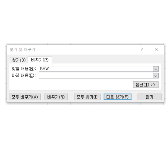 바꾸는 것이 아니고, 특정 문자열을 지우고 싶다면, 컨트롤 + H를 눌러 바꾸기를 실행해서 KRW를 아무것도 없는 것으로 모두 바꾸기 실행하면 됩니다.