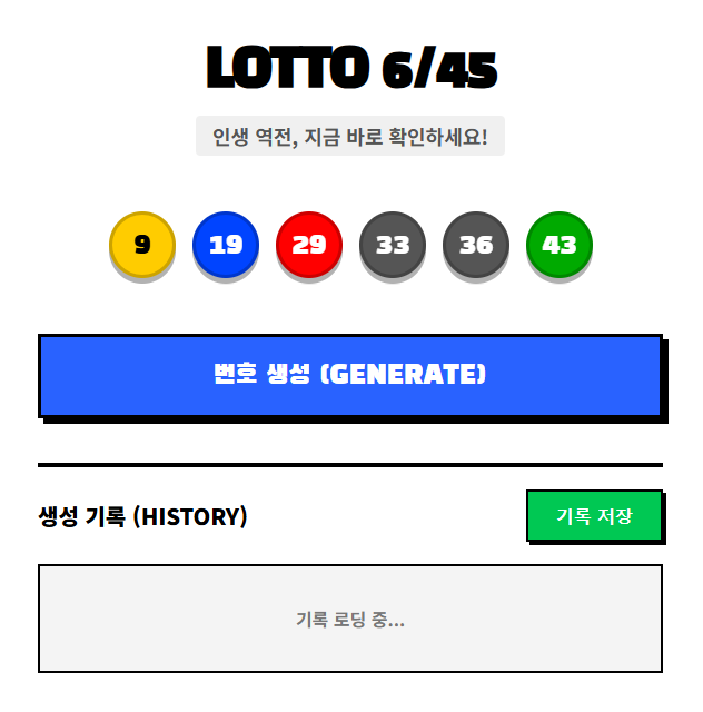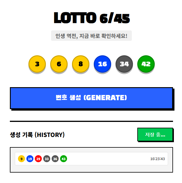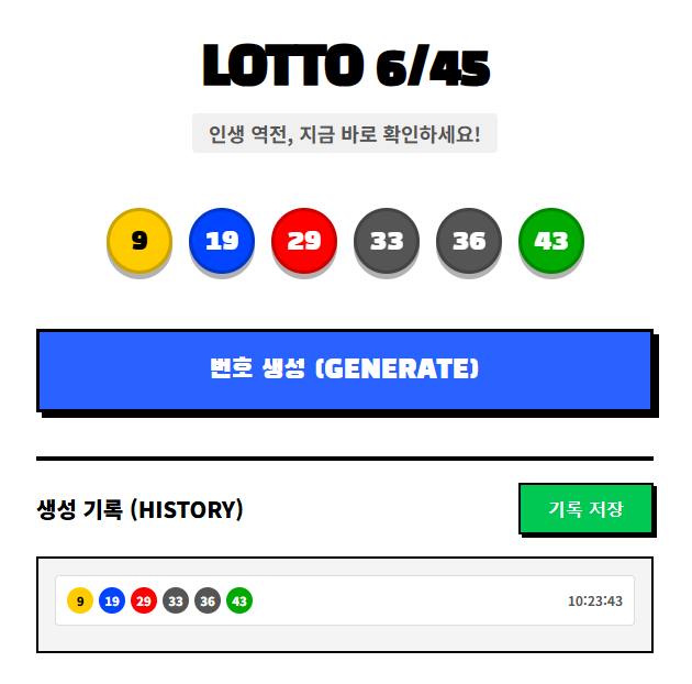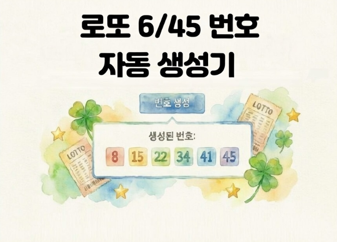안녕하세요. 제임스입니다~♣ 오늘은 누구나 무료로 사용할 수 있는 로또 6/45 번호 자동 생성기 웹 앱 링크를 올려 드립니다. 좋은 번호 골라서 대박이 나시기 바랍니다~ ^^
