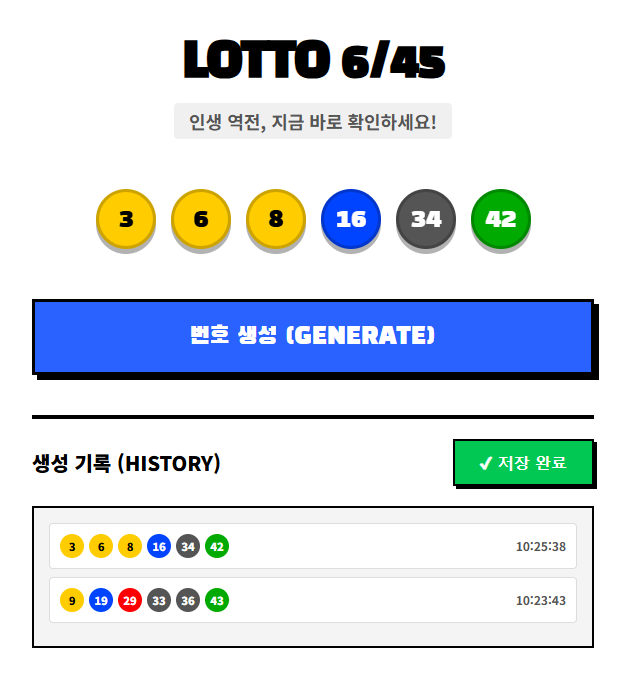 위와 같이 로또 번호가 생성되고, 아래와 같이 화면 아래 생성 기록이 작성 되어 보여집니다.